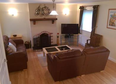 Spacious living area with comfortable soft & leather furniture