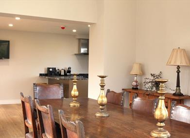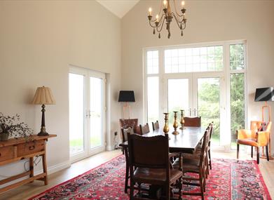 Large open plan kitchen with breakfast bar and comfortable living area. Spacious dining area with French doors leading to expansive gardens.