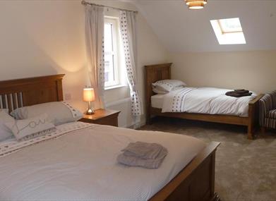 Upstairs there are two large family rooms each consisting of a king size and a single bed. Both bedrooms have en-suites – one with a shower room and the other with a bathroom with over bath shower.