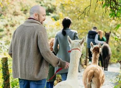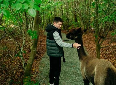 Your mini adventure starts when you arrive at our beautiful planted car park, with toilet facilities, including facilities for reduced mobility users and baby changing. You will be met on arrival by one of our friendly guides who will then introduce you to your alpaca. Your guide will take the group along our unique trail. This will take approx. 30 - 40mins. Near the end of the trail your guide will then tie up the alpacas before taking you out on the island with the coffee trailer and picnic tables, where you can purchase refreshments and snacks. You will then be free to wonder around the rest of the walk or just stay with the alpacas.