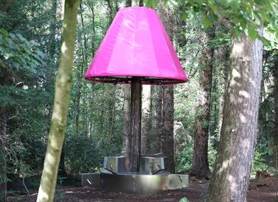 Power Up is a motion sculpture that has three foot pedal crank mechanisms. Users sit on the stainless steel base and pedal with both feet to power the LED lights above them.